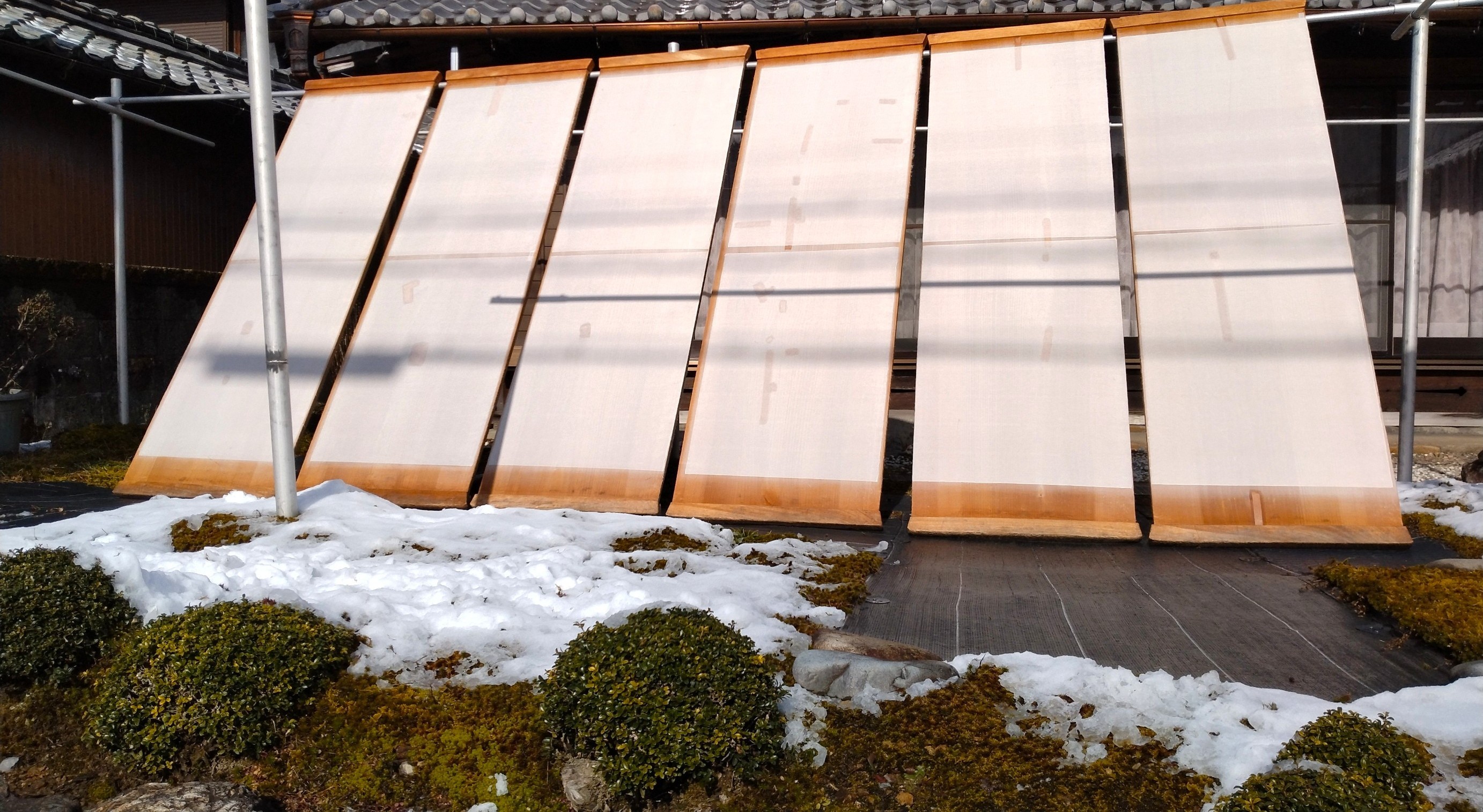 雪や雨、曇りの合間をぬって紙を干します